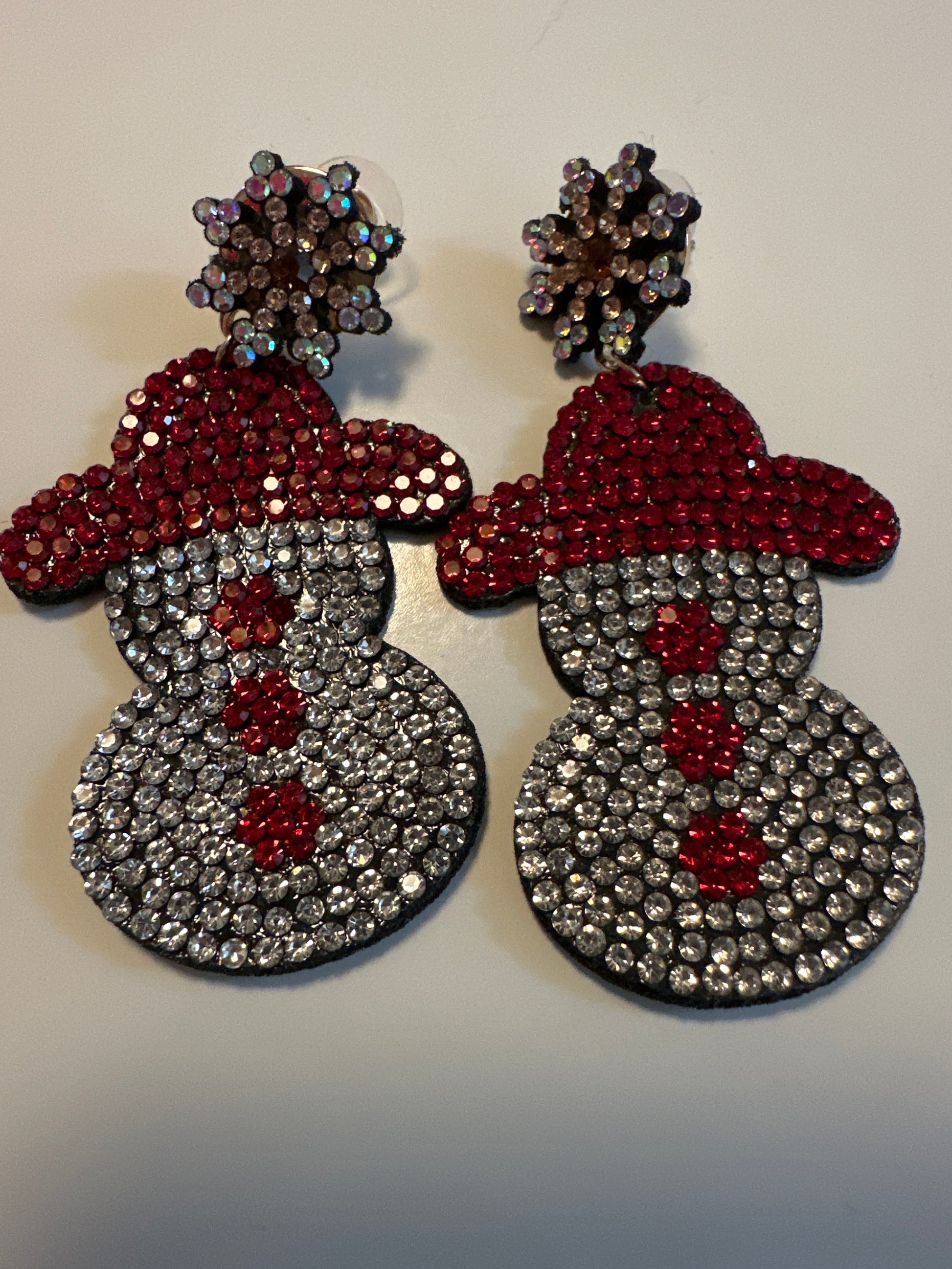Snowperson earrings with white and red rhinestones