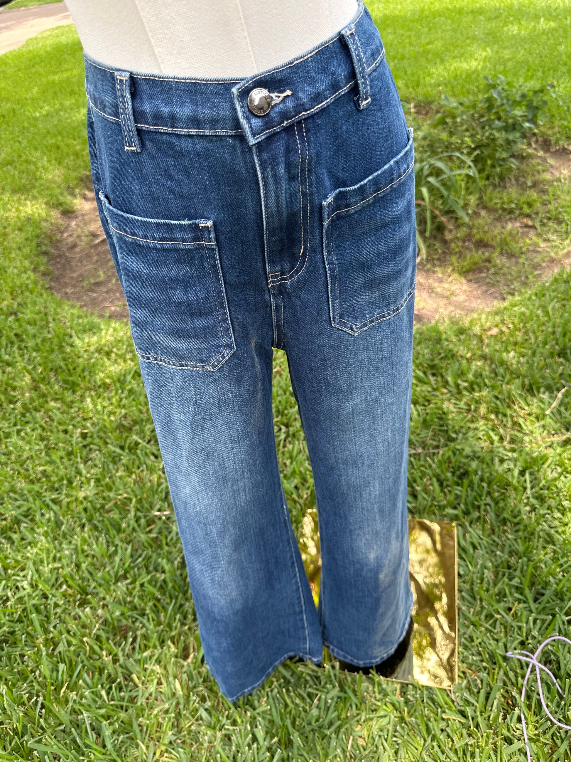 Front pocket flared denim jeans with elastic in the back of the waist. Model is wearing a small.