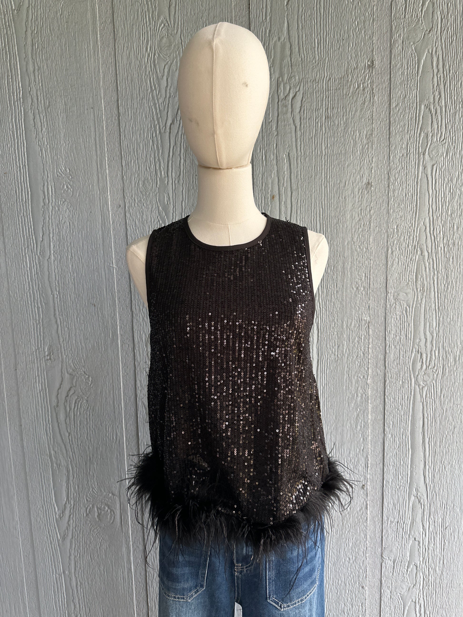 Black sequined tank with black feather trim