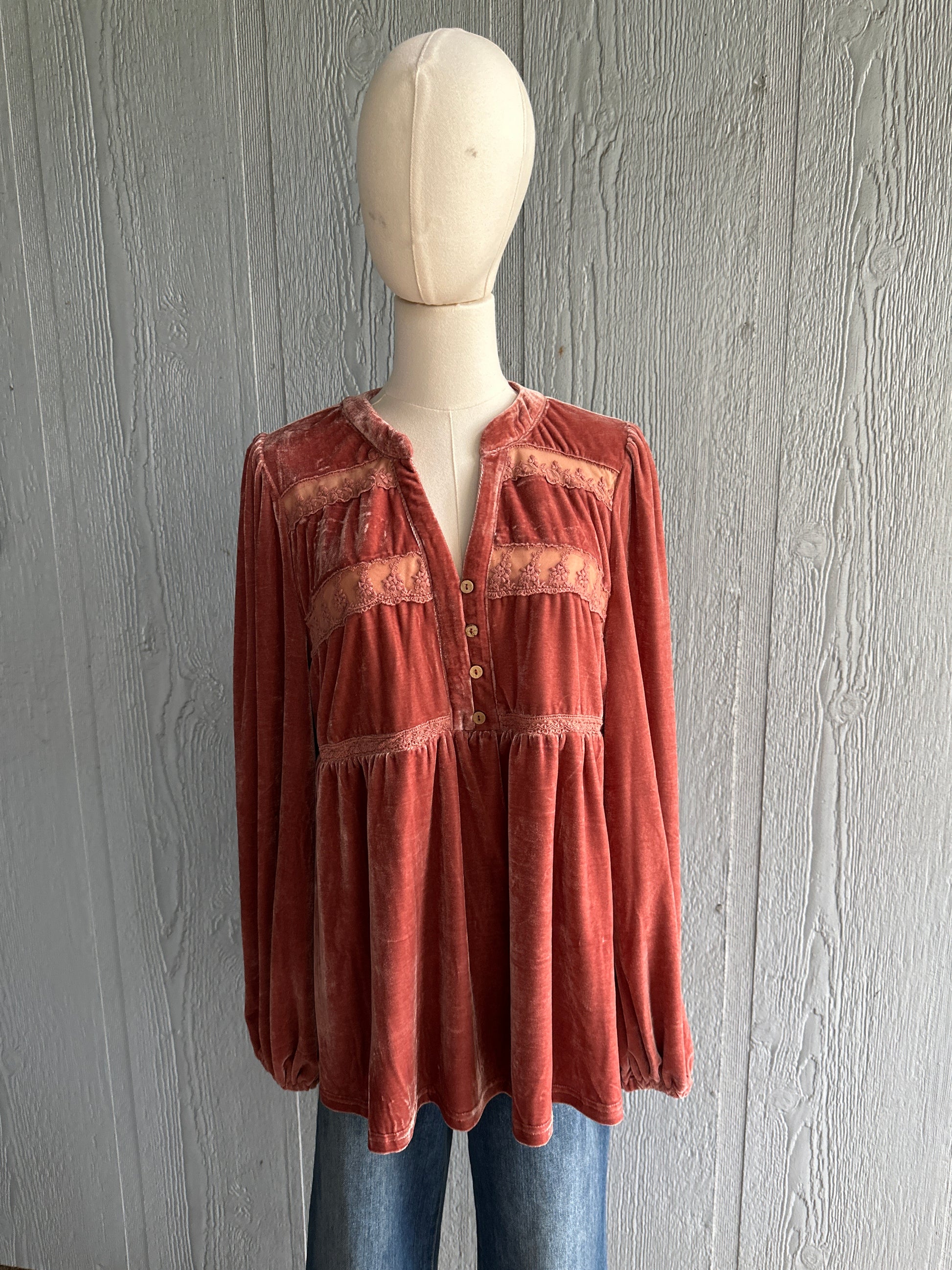 Oversized velour top with lace details in faded brick. You can size down