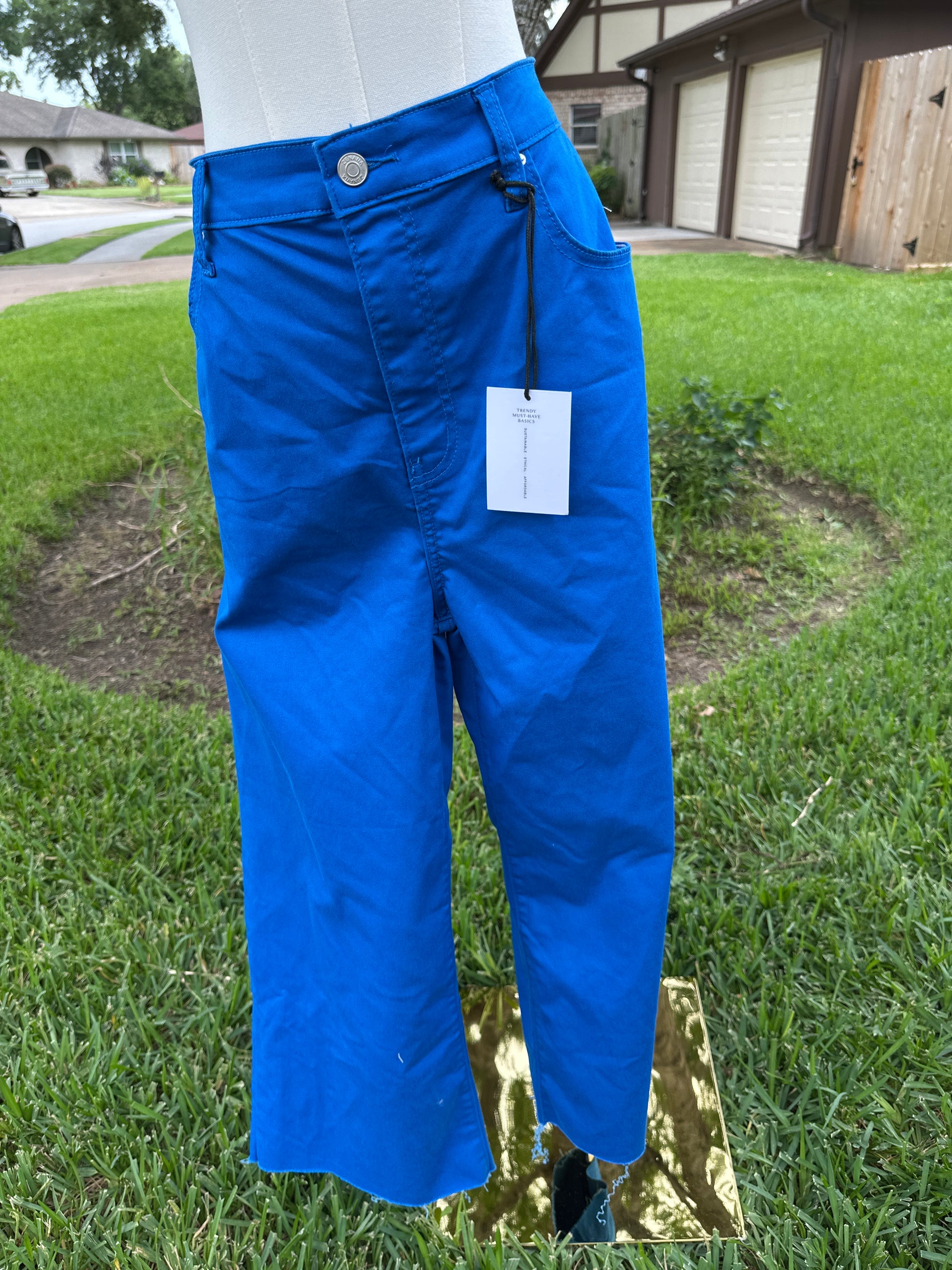 Curvy girl high rise flare crop pants in ocean blue. Model is wearing a 2X. All sales are final.