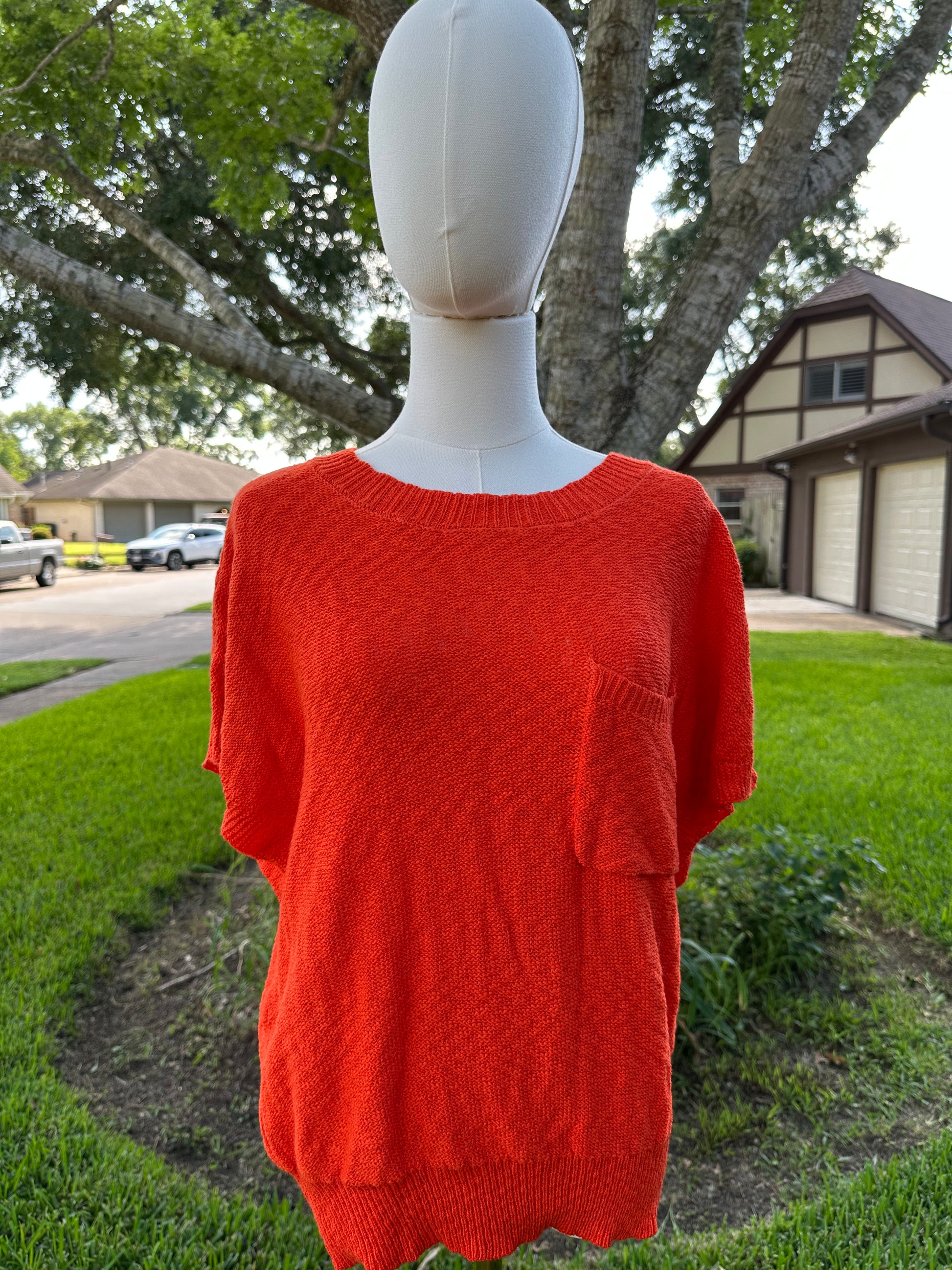Short sleeve lightweight sweater in tomato. Model is wearing a small.