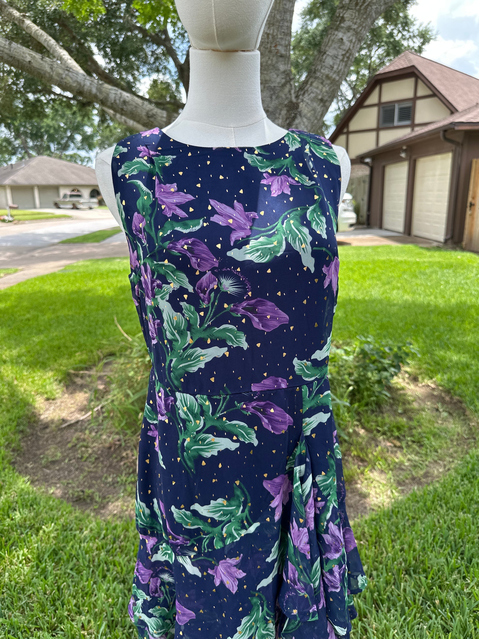 Sleeveless woven floral print dress in navy. Model is wearing a medium. All sales are final.